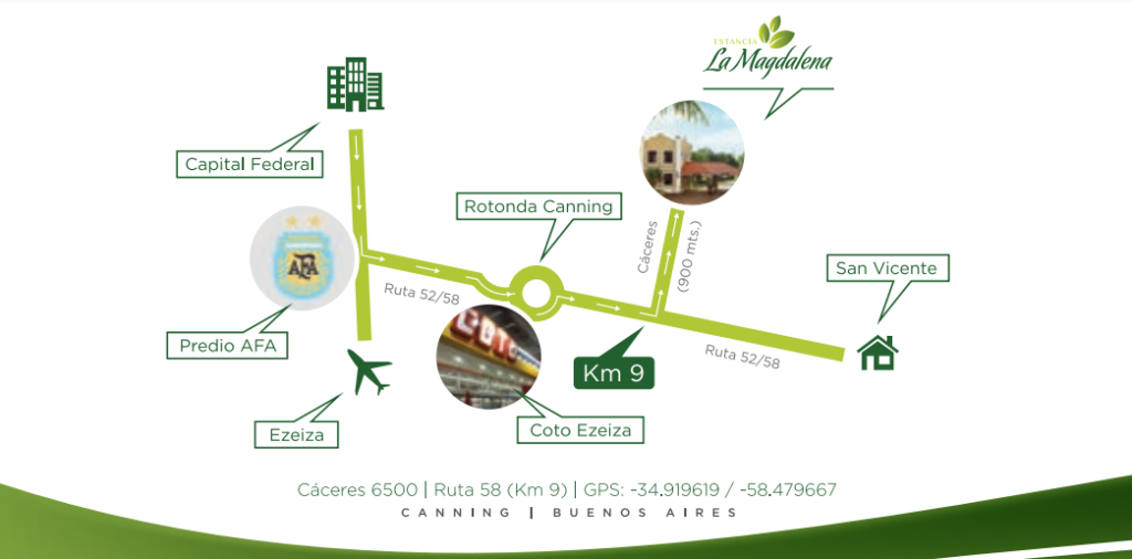 El country La Magdalena queda en la calle Cáceres 6500, a la altura del kilómetro 9 de la Ruta 58. Está conformado por 4 barrios desarrollados en una superficie de 200 hectáreas. Es un lugar con historia, ya que fue la estancia de la familia del Presidente Julio Argentino Roca. Ubicado a sólo 35 minutos de Capital Federal, Canning, es la zona de mayor crecimiento inmobiliario de la Provincia de Buenos Aires de los últimos 20 años.